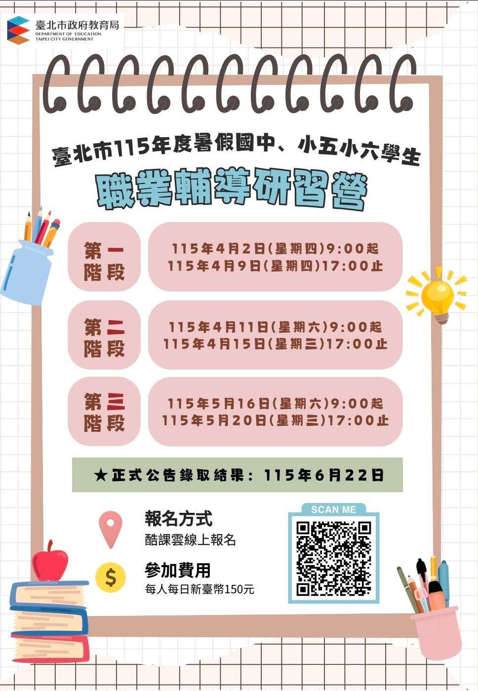 2、第2次線上報名:115年4月11日(星期六)起至115年4月15日(星期三)止,115年4月20日(星期一)由系統推播發送個人錄取情形。