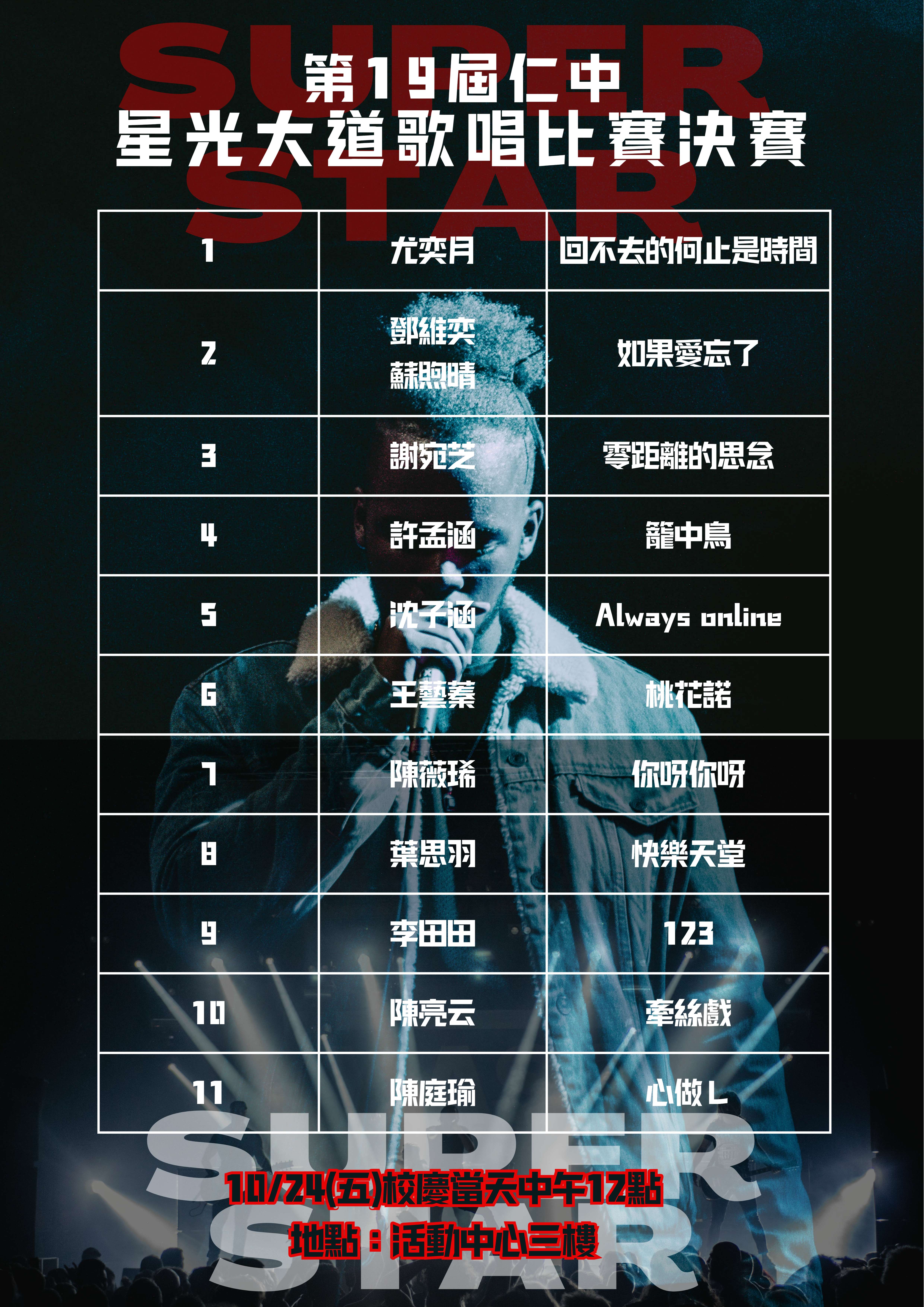 第19屆仁中星光大道歌唱比賽-決賽名單參附件。